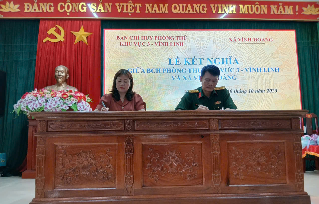 Nhằm tăng cường mối quan hệ gắn bó, đoàn kết giữa lực lượng vũ trang với cấp ủy, chính quyền và nhân dân địa phương, chiều ngày 10/10/2025, tại trụ sở UBND xã Vĩnh Hoàng, Ban Chỉ huy Phòng thủ khu vực 3 - Vĩnh Linh và xã Vĩnh Hoàng đã tổ chức Lễ ký kết kết nghĩa giữa hai đơn vị.