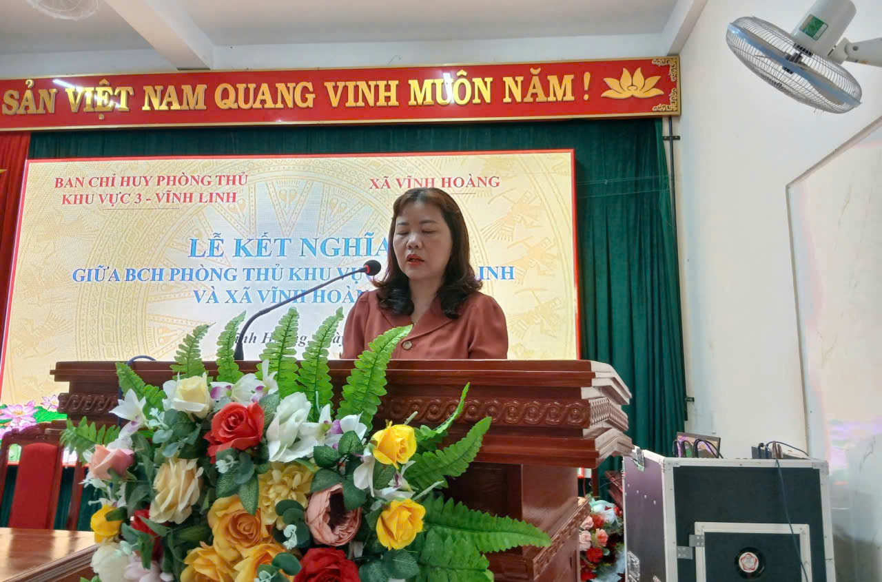 Phát biểu tại buổi lễ, đồng chí Nguyễn Thị Hương - Bí thư Đảng ủy, Chủ tịch HĐND xã Vĩnh Hoàng khẳng định: Việc ký kết kết nghĩa giữa hai đơn vị là hoạt động có ý nghĩa thiết thực, góp phần thắt chặt tình đoàn kết quân - dân, đồng thời phát huy sức mạnh tổng hợp trong xây dựng khu vực phòng thủ vững chắc.