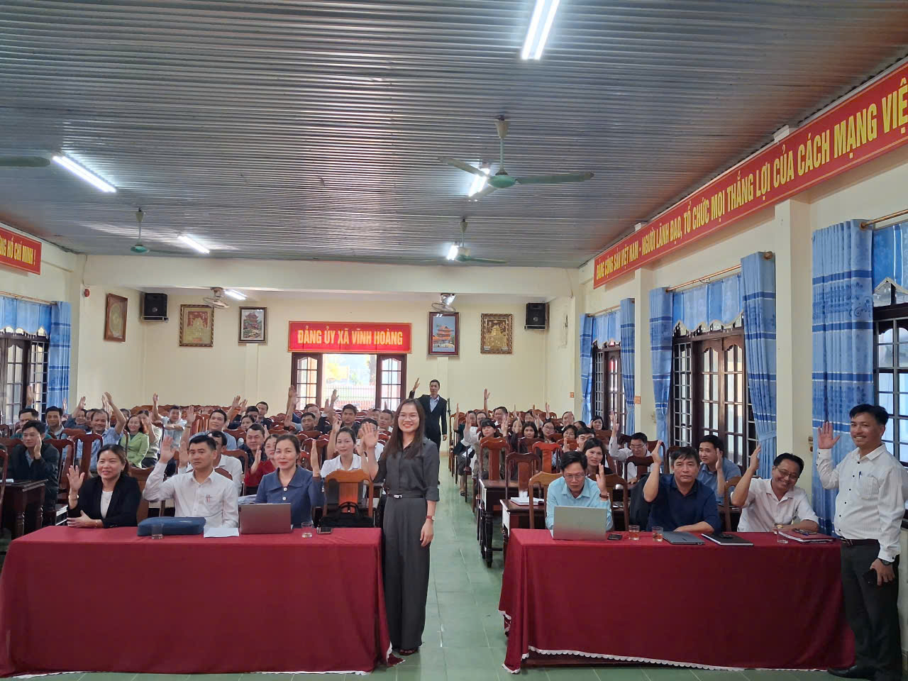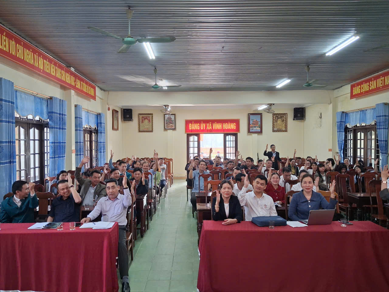 Hội nghị tiến hành biểu quyết bằng hình thức giơ tay; 100% cử tri tham dự nhất trí giới thiệu 25 nhân sự ứng cử đại biểu HĐND xã Vĩnh Hoàng nhiệm kỳ 2026 - 2030.