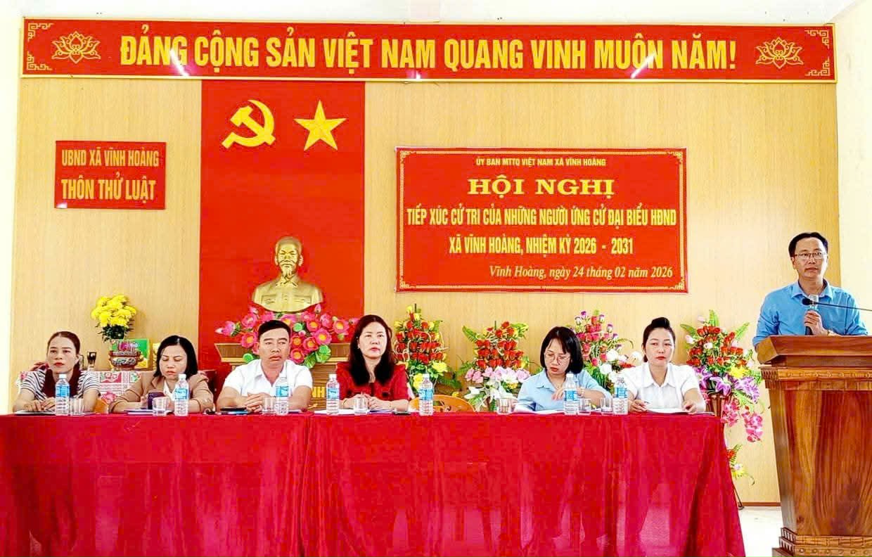 Tính đến ngày 28/2, xã Vĩnh Hoàng đã hoàn thành tiếp xúc cử tri của những người ứng cử đại biểu HĐND xã Vĩnh Hoàng, nhiệm kỳ 2026-2031 tại 18 điểm bỏ phiếu thuộc 05 đơn vị bầu cử trên toàn địa bàn. Các hội nghị tiếp xúc cử tri được tổ chức đảm bảo đúng quy định của pháp luật, dân chủ, công khai và an toàn.