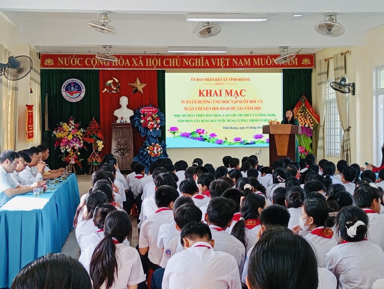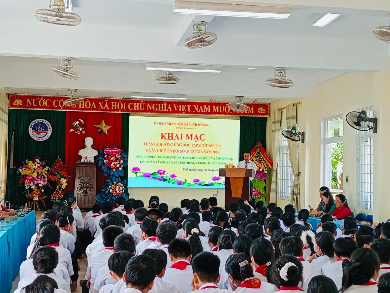 Thực hiện Kế hoạch số 1036/KH-UBND ngày 22/9/2025 của UBND tỉnh Quảng Trị; Công văn số 1300/SGDĐT-GDNNTX ngày 23/9/2025 của Sở Giáo dục & Đào tạo; Kế hoạch số 39/KH-UBND ngày 29/9/2025 của UBND xã Vĩnh Hoàng, sáng ngày 01/10/2025, UBND xã Vĩnh Hoàng long trọng tổ chức Lễ khai mạc Tuần lễ hưởng ứng học tập suốt đời và Ngày Chuyển đổi số Quốc gia năm 2025 tại Trường TH & THCS Trung Nam.