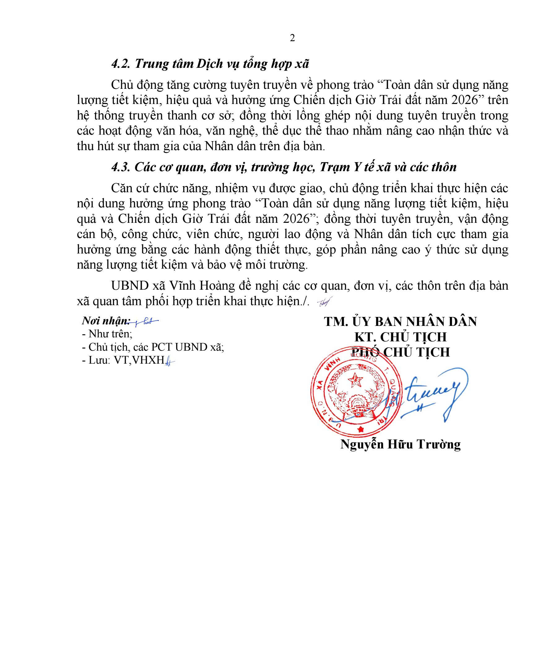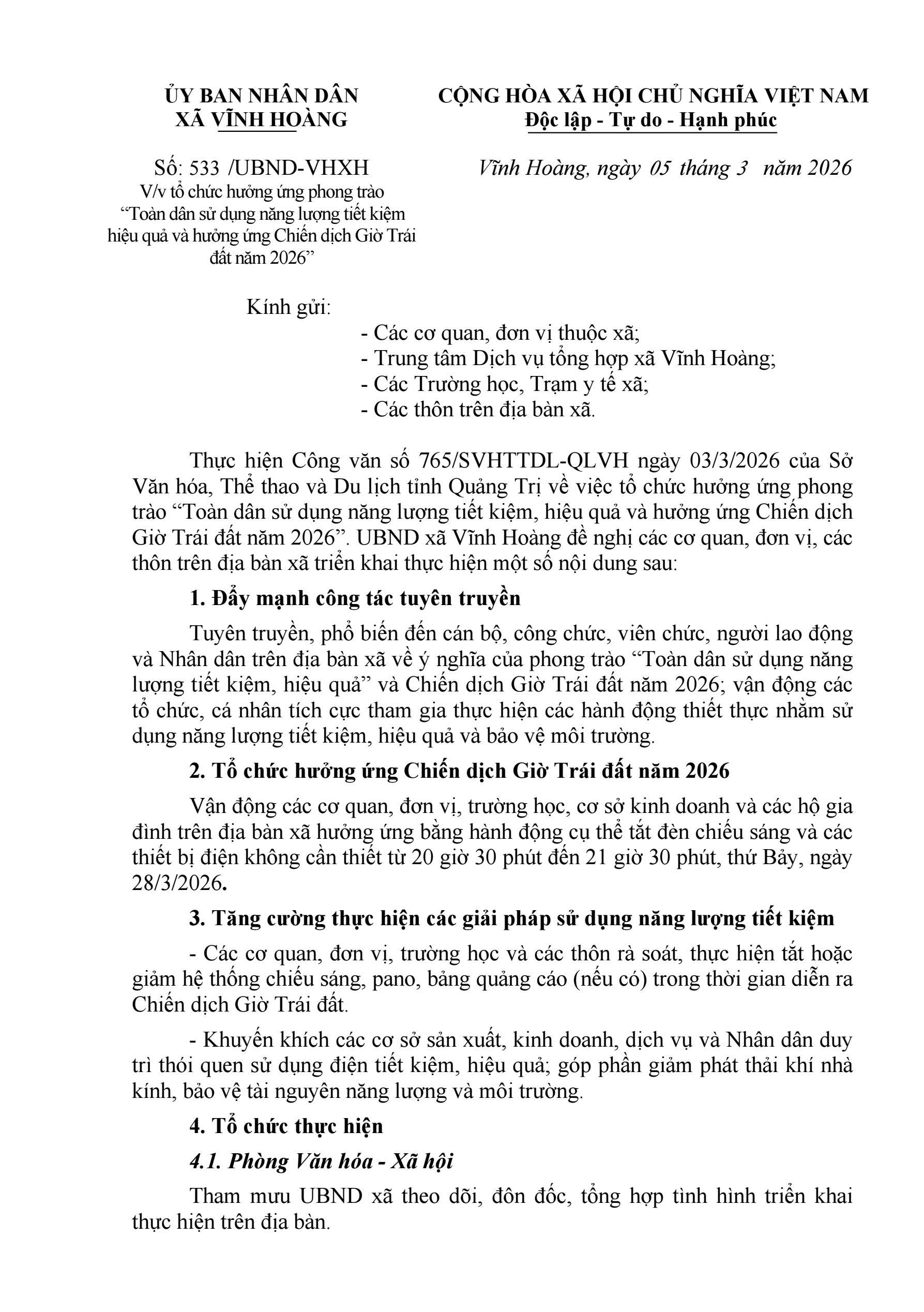 Thực hiện Công văn số 765/SVHTTDL-QLVH ngày 03/3/2026 của Sở Văn hóa, Thể thao và Du lịch tỉnh Quảng Trị về việc tổ chức hưởng ứng phong trào “Toàn dân sử dụng năng lượng tiết kiệm, hiệu quả và hưởng ứng Chiến dịch Giờ Trái đất năm 2026”, UBND xã Vĩnh Hoàng đề nghị các cơ quan, đơn vị, các thôn trên địa bàn xã triển khai thực hiện một số nội dung sau: