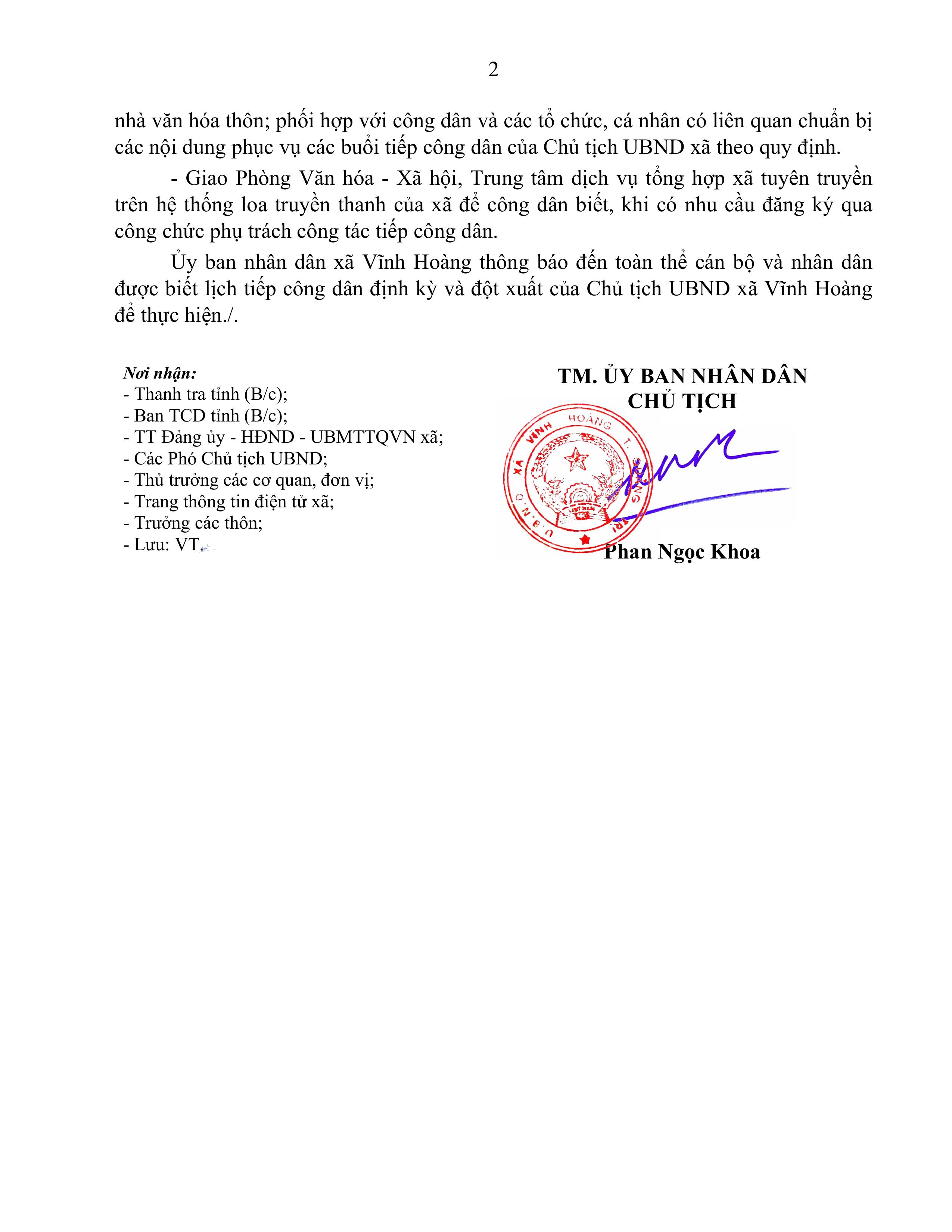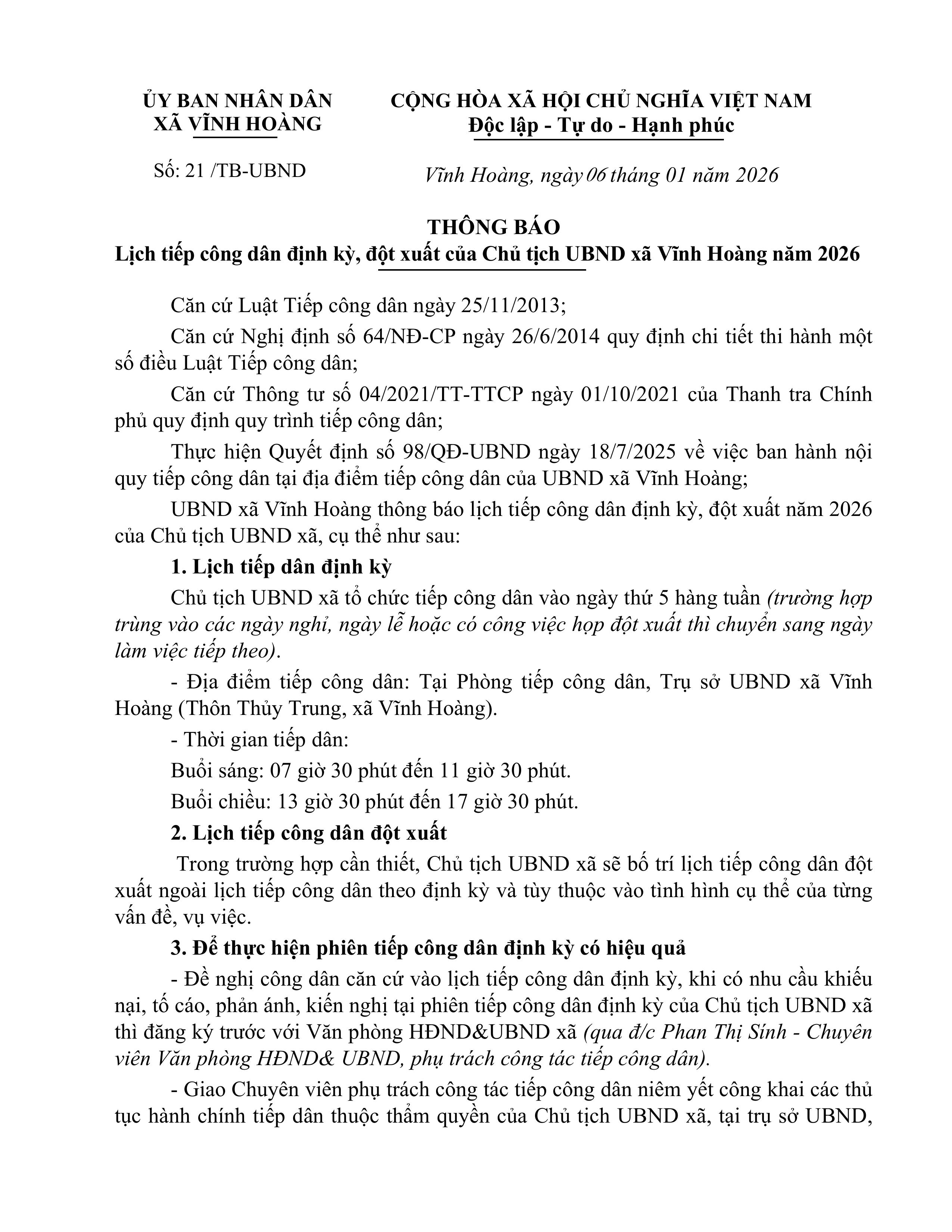 Chủ tịch UBND xã tổ chức tiếp công dân vào ngày thứ 5 hàng tuần (trường hợp trùng vào các ngày nghỉ, ngày lễ hoặc có công việc họp đột xuất thì chuyển sang ngày làm việc tiếp theo)