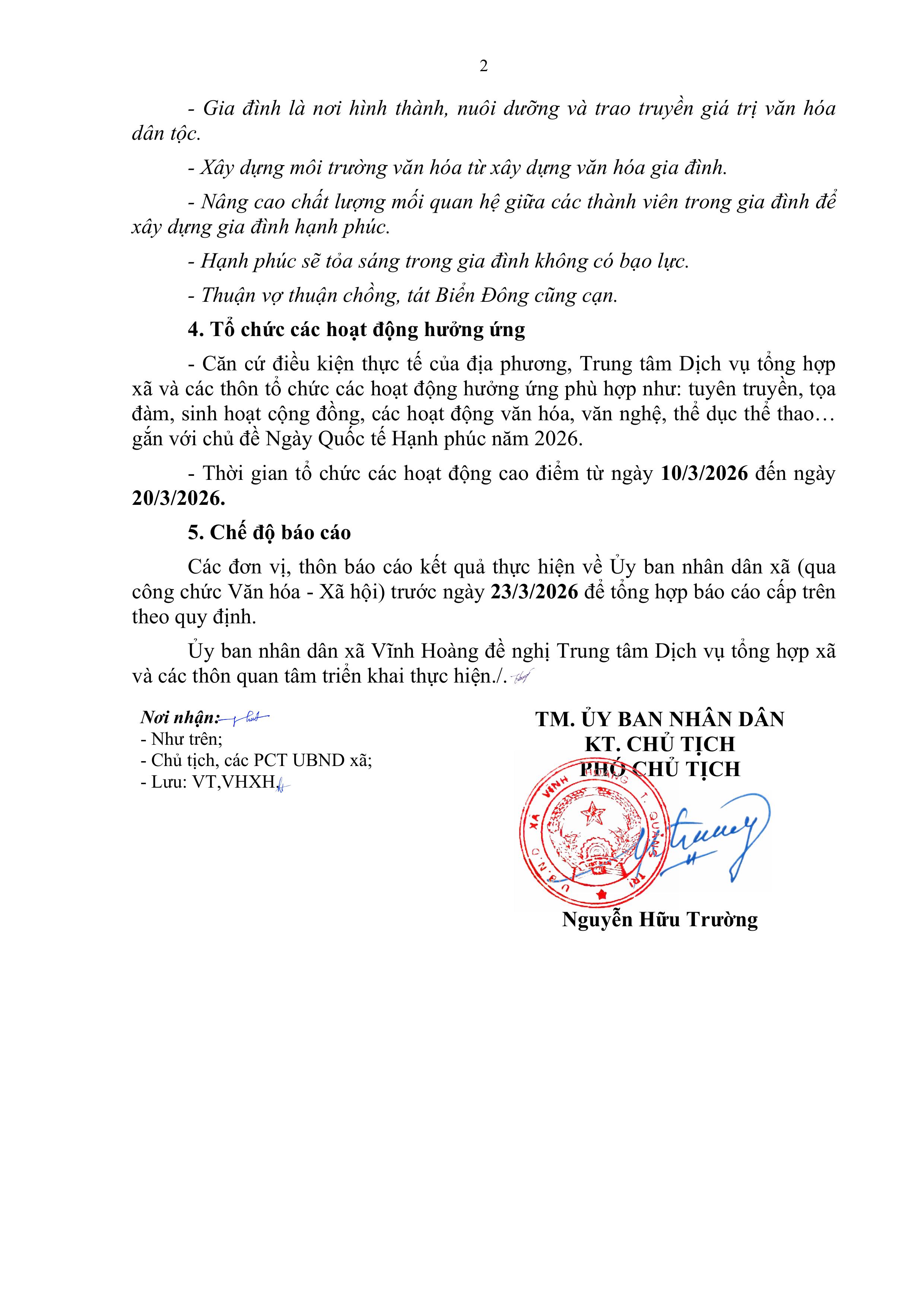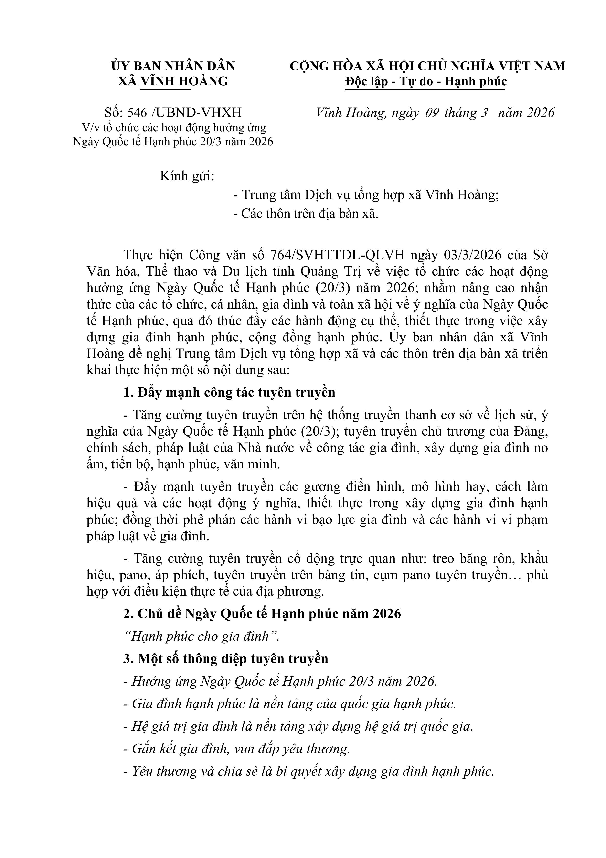 Thực hiện Công văn số 764/SVHTTDL-QLVH ngày 03/3/2026 của Sở Văn hóa, Thể thao và Du lịch tỉnh Quảng Trị về việc tô chức các hoạt động hưởng ứng Ngày Quốc tế Hạnh phúc (20/3) năm 2026; nhằm nâng cao nhận thức của các tô chức, cá nhân, gia đình và toàn xã hội về ý nghĩa của Ngày Quốc tế Hạnh phúc, qua đó thúc đẩy các hành động cụ thể, thiết thực trong việc xây dựng gia đình hạnh phúc, cộng đồng hạnh phúc. Ủy ban nhân dân xã Vĩnh Hoàng đề nghị Trung tâm Dịch vụ tông hợp xã và các thôn trên địa bàn xã triển khai thực hiện một số nội dung sau: