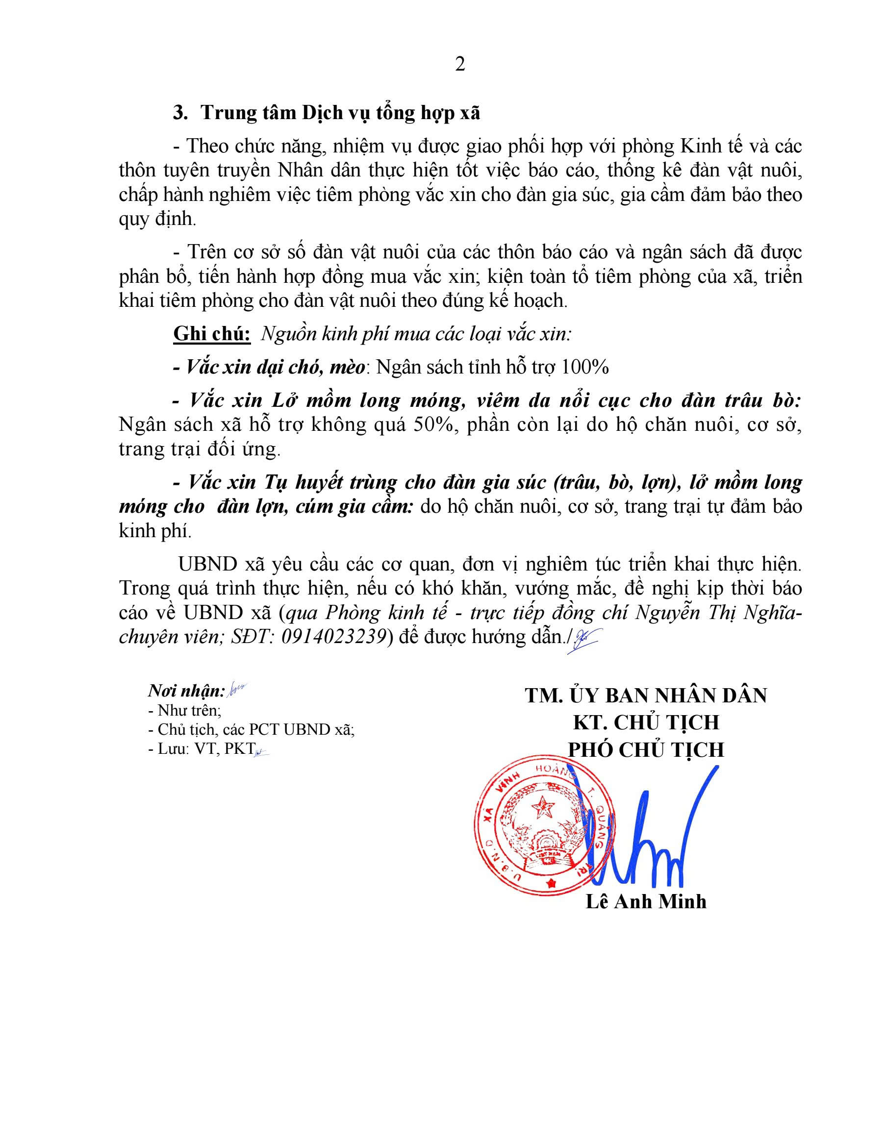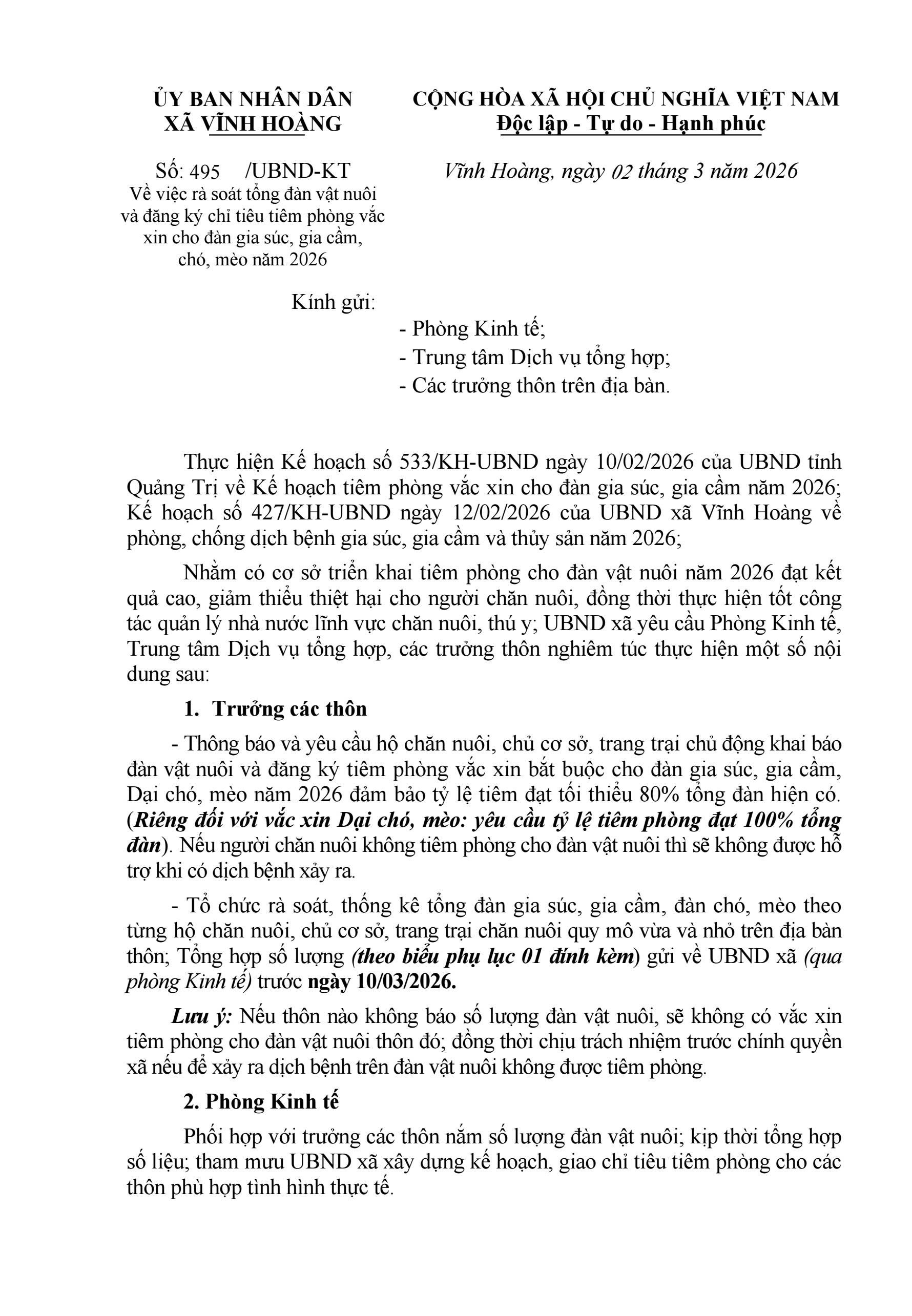 Nhằm có cơ sở triển khai tiêm phòng cho đàn vật nuôi năm 2026 đạt kết quả cao, giảm thiểu thiệt hại cho người chăn nuôi, đồng thời thực hiện tốt công tác quản lý nhà nước lĩnh vực chăn nuôi, thú y; UBND xã Vĩnh Hoàng yêu cầu Phòng Kinh tế, Trung tâm Dịch vụ tổng hợp, các trưởng thôn nghiêm túc thực hiện một số nội dung sau: