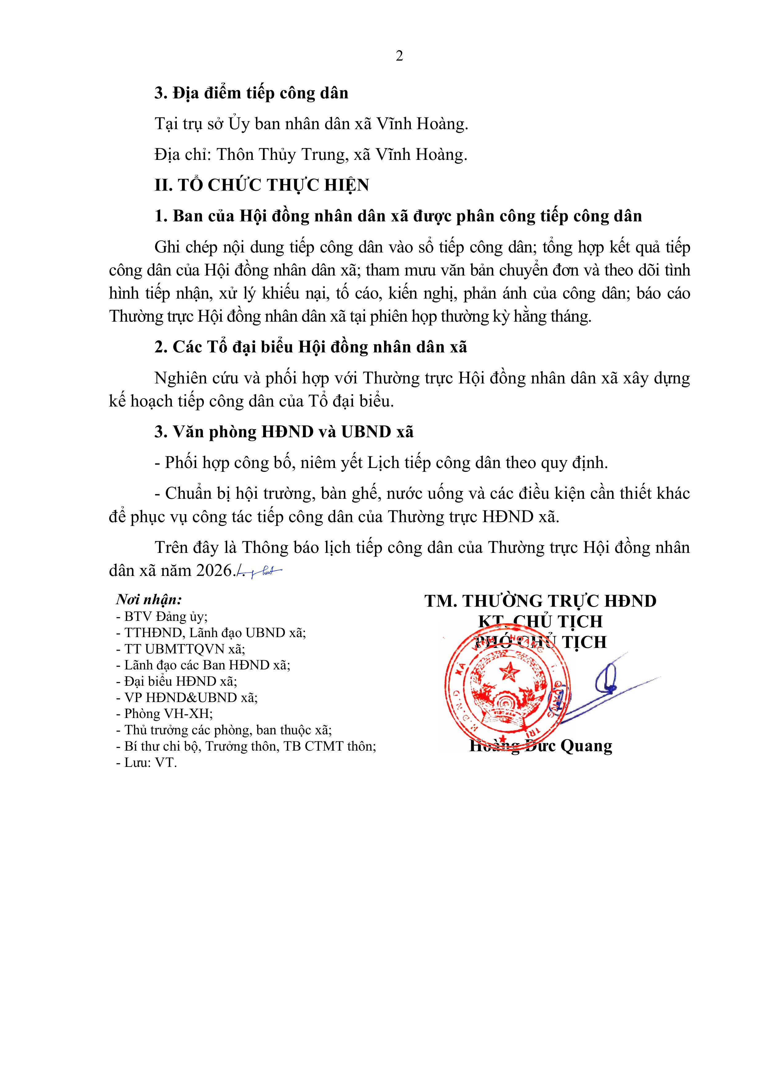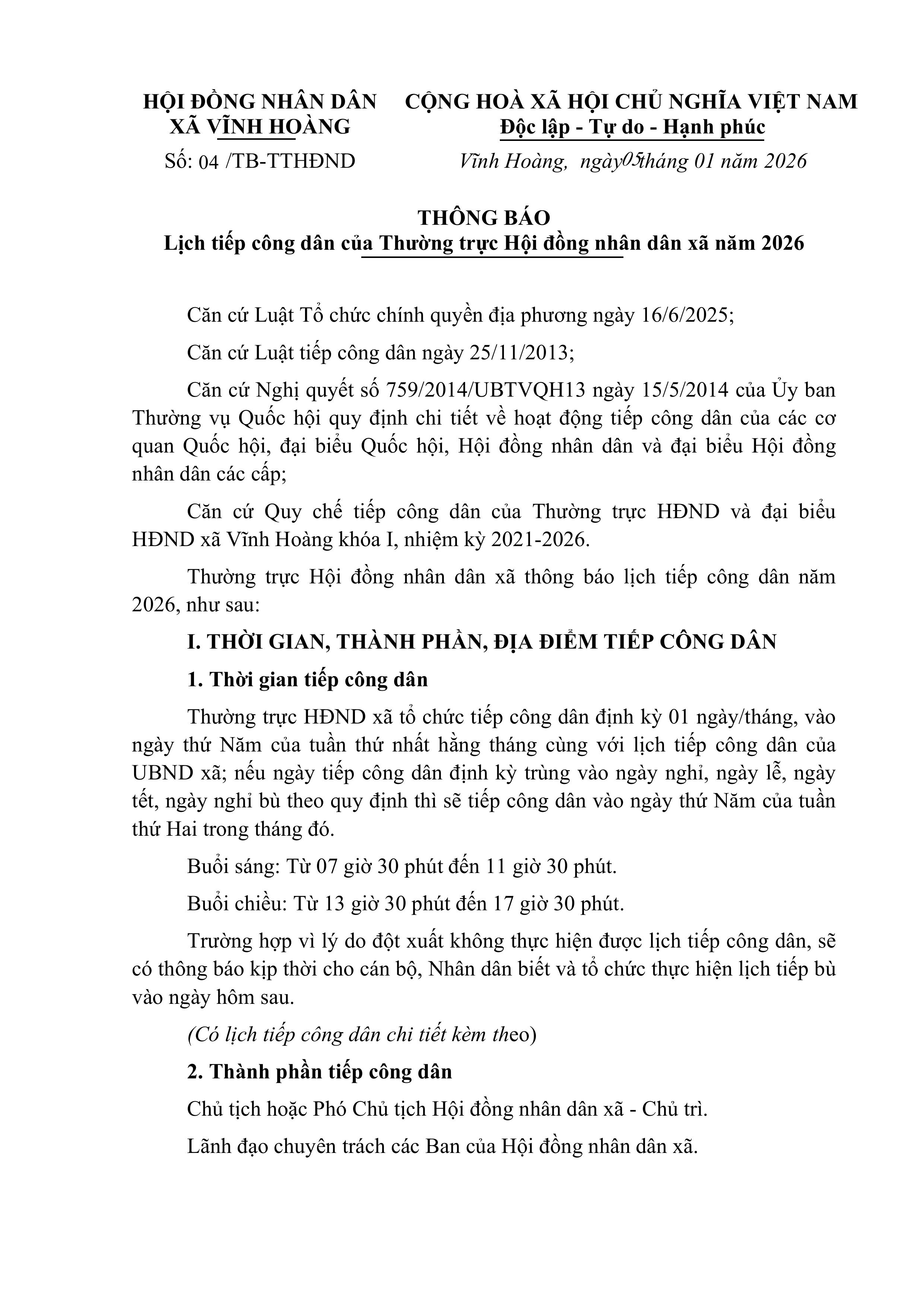 Thông báo Lịch tiếp công dân của Thường trực Hội đồng nhân dân xã Vĩnh Hoàng năm 2026