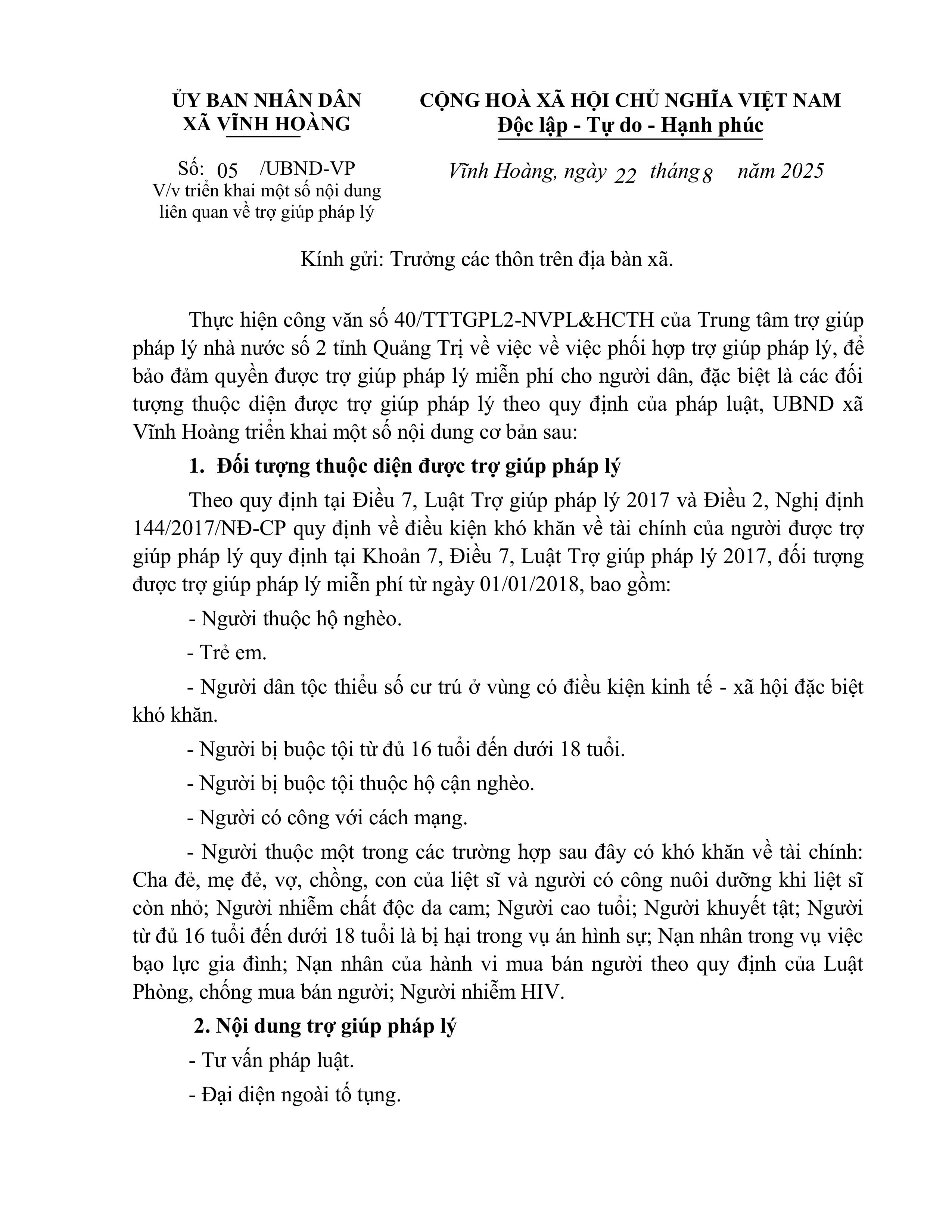 Thực hiện công văn số 40/TTTGPL2-NVPL&HCTH của Trung tâm trợ giúp pháp lý nhà nước số 2 tỉnh Quảng Trị về việc về việc phối hợp trợ giúp pháp lý, để bảo đảm quyền được trợ giúp pháp lý miễn phí cho người dân, đặc biệt là các đối tượng thuộc diện được trợ giúp pháp lý theo quy định của pháp luật, UBND xã Vĩnh Hoàng triển khai một số nội dung cơ bản sau: